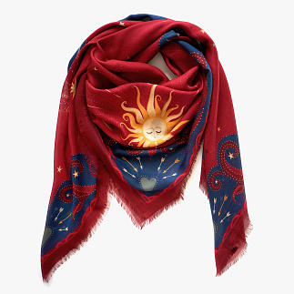 Bathed in a beautiful light, the moon sleeps without a care on a majestic blue sky. The design of this luxury silk scarf is a hymn dedicated to love, to all the hearts that beat wildly, to all those who have their heads in the stars.